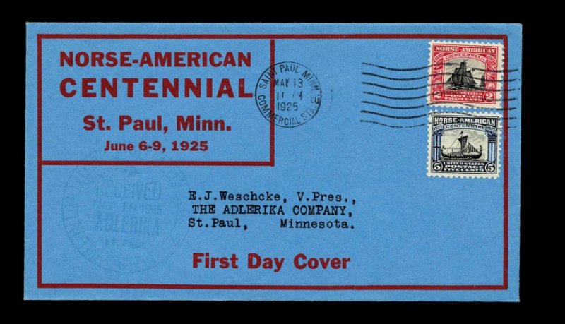 993 F 620-21 image#620-621, 2c-5c Norse American cplt., set tied to an immaculate blue first day cover by "Saint Paul Minn Commercial Sta. 2/May 13/1925" machine cancel, with first Ernest J. Weschcke cachet (Planty #5) at top left, extremely fine and beautiful; a scarce and undervalued cachet. (Image) Mellone 300.00
