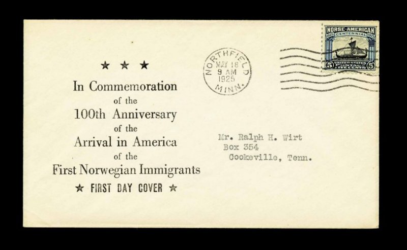 994 F 620-21 image#620-621, 2c-5c Norse American cplt., tied to separate first day covers by matching "Northfield Minn./May 18/1925" machine cancels, with first Ralph Wirt serviced cachet (Planty #13), very fine; the 5c example was used for illustration in the Planty catalog. (Image) Est. 150-200