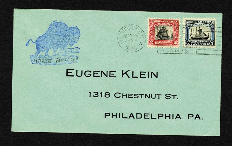 995 F 620-21 image#620-621, 2c-5c Norse American cplt., group of nine first day covers, mostly better cacheted items including cplt. set on both the first Roessler and first Weschcke cachets, also a set on separate covers with Herst cachets (Planty #6), as well as separate covers with labels (Planty #11), an unlisted Buffalo rubber stamp cachet (see photo), plus there are two non-cacheted items (2c block of eight and 5c on unofficial Air Mail Field cover), mostly very fine. (Image) Est. 400-500