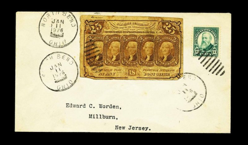 996 F 622 image#622, 13c Green, two Worden addressed first day covers tied by "North Bend Ohio/Jan 11 1926" pmks., each with 5c or 25c Postage currency (Scott #PC5, PC7) tied also, fine-very fine; a most unusual and rare pair of first day covers. (Image) Est. 400-500
