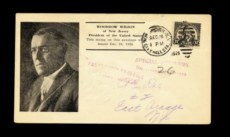 997 F 623 image#623, 17c Black, tied to first day cover by "New York City Hall Sta./Dec 28/1925" duplex pmk., with unlisted Roessler cachet of Woodrow Wilson, very fine. (Image) Mellone 300.00