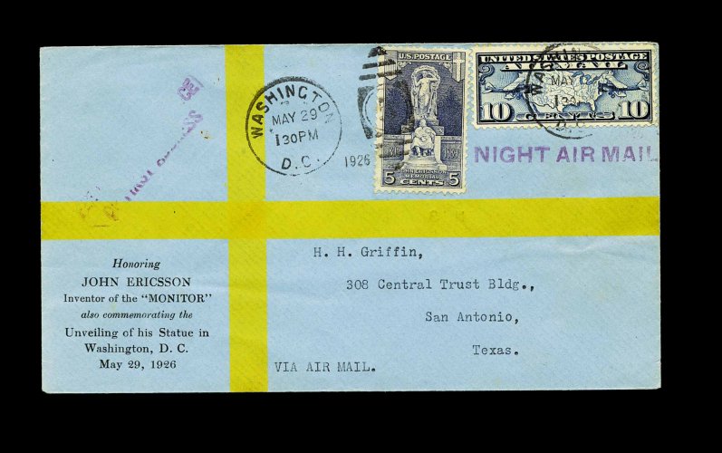 999 F 628 image#628, 5c Ericsson, four May 29, 1926 first day covers, being from the four different official cities, each with the Griffin cachet of blue and yellow making the Swedish flag (Planty #2), Washington also franked with #C7 and "Night Air Mail" handstamp, a very fine and choice set; this scarce and highly sought-after cachet is rarely offered as a complete city set. (Image) Mellone 1,800.00