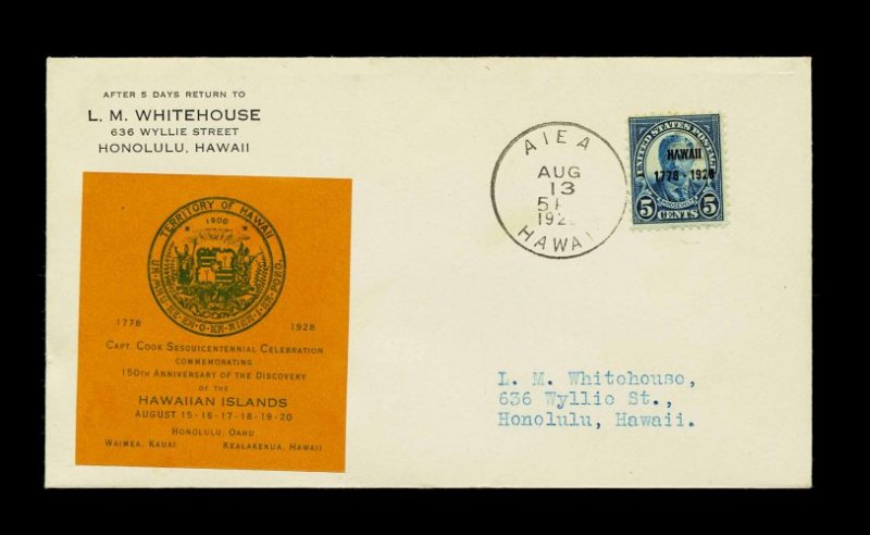 1021 F 647-48 image#647-648, 2c-5c Hawaii Sesquincentennial, set tied to separate first day covers by the rare "Aiea Hawaii/Aug 13/1928" duplex pmks., both with Whitehouse cachet in orange and green (Planty #5), uncommonly fresh, extremely fine; believed to be the only set from Aiea. (Image) Est. 300-400