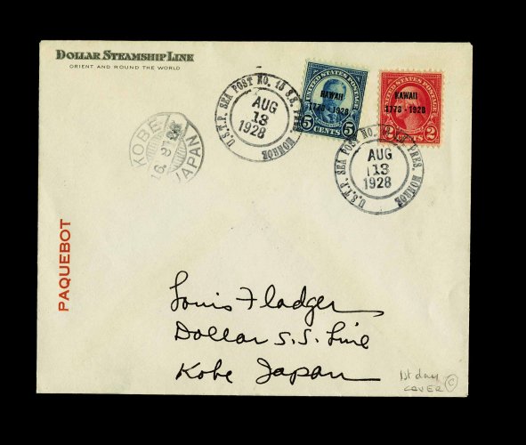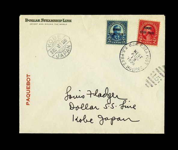 1023 F 647-48 image#647-648, 2c-5c Hawaii Sesquincentennial, tied to first day cover by very scarce "U.S.T.P. Sea Post No. 15 S.S. Pres. Monroe/West/Aug 13/1928/15" duplex pmk. (Planty #13), posted at sea and sent to Kobe, Japan with receiving postmark, Dollar Steamship Line corner card, very fine; a very rare unofficial usage; this cover is used for the illustration in Planty. (Image) Est. 200-300