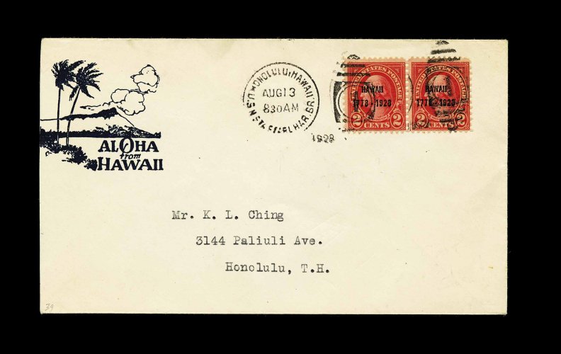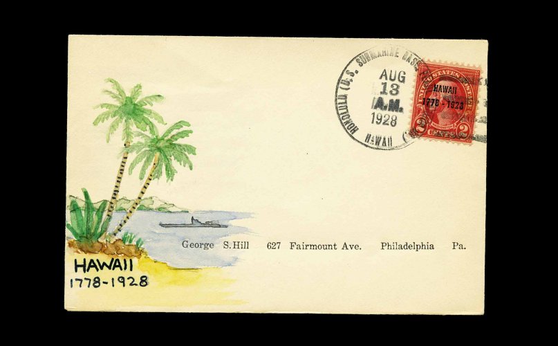 1031 F 647 image#647, 2c Hawaii Sesquincentennial, tied to first day cover by "Honolulu (U.S. Submarine Base, Pearl Harbor) Hawaii/Aug 13/1928" pmk., with hand-painted add on cachet at left, very fine; a very scarce unofficial cancel. (Image) Est. 150-200