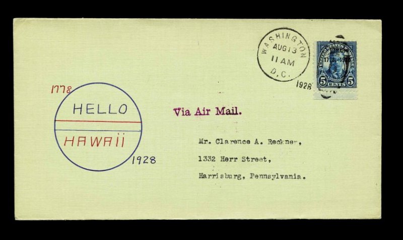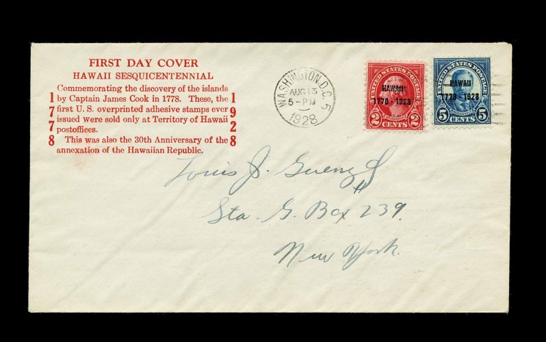 1026 F 647-48 image#647-648, 2c-5c Hawaii Sesquincentennial, tied to first day cover by "Washington, D.C./Aug 13/1928" machine cancel, with Red text cachet (Planty #23), possibly an add-on, flaps ungummed, cover with very slight wrinkling, still very fine; a very scarce cachet. (Image) Mellone 250.00