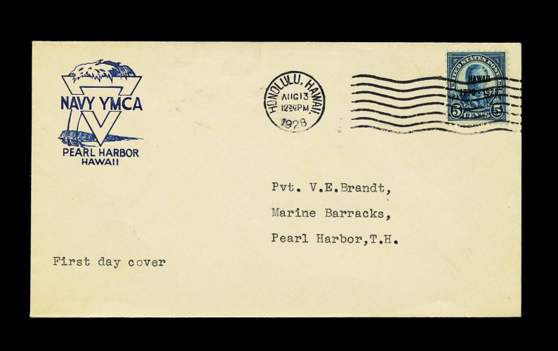 1027 F 647-48 image#647-648, 2c-5c Hawaii Sesquincentennial, on separate first day covers tied by "Honolulu Hawaii/Aug 13/1928" machine cancels, with matched unlisted blue Navy YMCA cachet, very fine; a rarely seen cachet. (Image) Est. 150-200