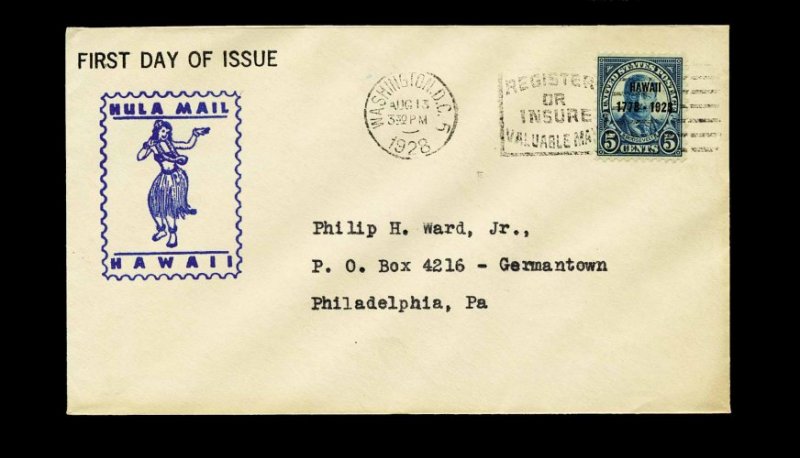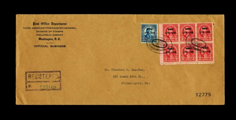 1029 F 647-48 image#647-648, 2c-5c Hawaii Sesquincentennial, block of six of 2c and single of 5c tied to long registered first day cover by oval mute cancels, purple "Washington D.C. Reg. Sec./Aug 13/1928" pmks. on back, Post Office imprint of the Third Assistant Postmaster General at top left, sent to Philadelphia, a very fine and unusual usage. (Image) Est. 150-200