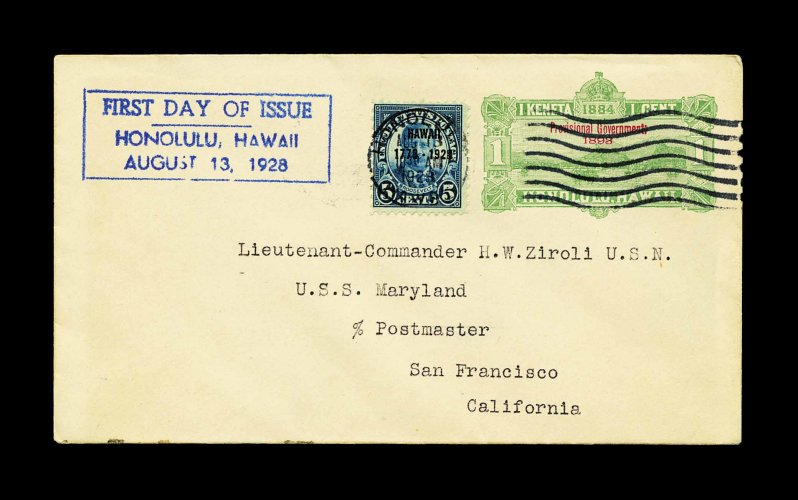1030 F 647-48 image#647-648, 2c-5c Hawaii Sesquincentennial, group of four Aug. 13, 1928 first day covers, each on Hawaii "Provisional Govt. 1898" entires (Scott #U10, U11, U13), each tied by Honolulu machine cancel, blue First Day of Issue rubber handstamp at top left, with a set of each value on separate 1c Entires, and 2c value on the 2c and 10c Entires, all addressed to Lt. Commander Ziroli in San Francisco, very fine; these could very well be the only examples of first day covers on Hawaiian entires. (Image) Est. 400-500