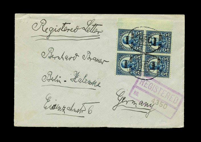 1032 F 648 image#648, 5c Hawaii Sesquincentennial, right sheet-margin block of four tied to registered first day cover by double oval "Reg" and purple boxed registry handstamp, purple "Honolulu Hawaii Registered/Aug 13/1928" pmk. on back, sent to Germany, with New York Foreign pmk. and Berlin arrival, Royal Hawaiian Hotel embossed stationery emblem on backflap, neatly opened at bottom, very fine; a very rare commercial usage of a first day cover. (Image) Est. 150-200