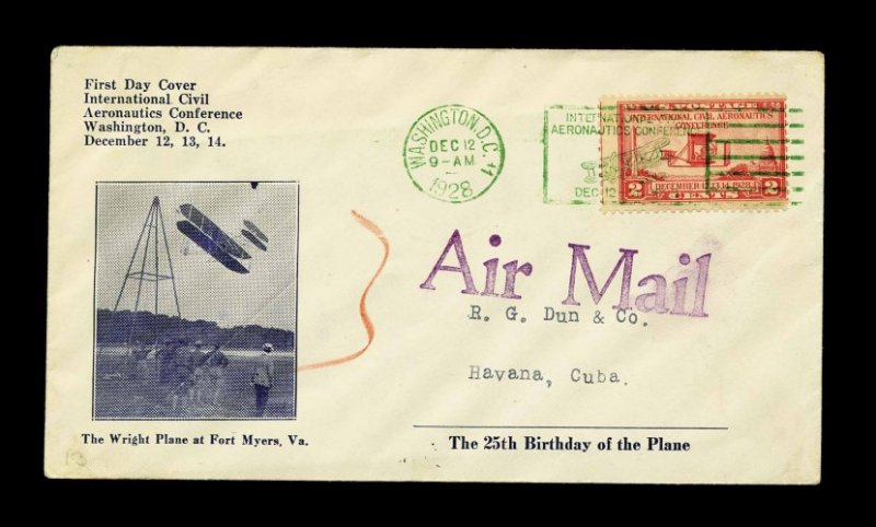 1034 F 649-50 image#649-650, 2c-5c Aeronautics, nine December 12, 1928 first day covers, five are cacheted including 2c on Planty #2A (to Cuba) and #2B, 5c on Planty #8A, 2c and 5c blocks on separate Planty #19 covers, three are used on civil war patriotics, generally very fine. (Image) Est. 150-200