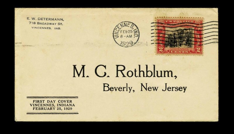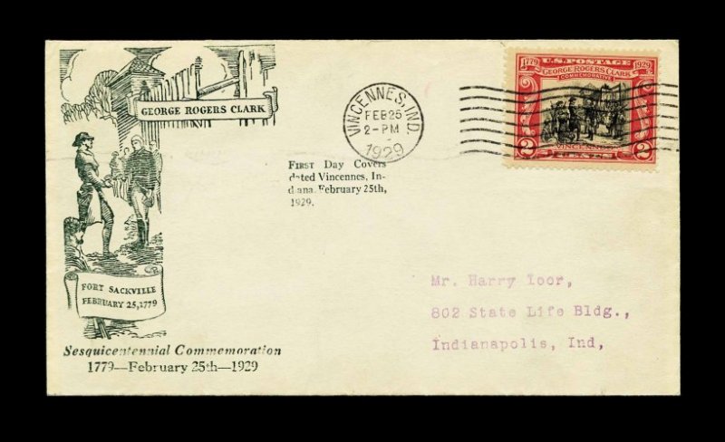 1036 F 651 image#651, 2c George Rogers Clark, lot of thirteen February 25, 1929 first day covers, nine are cacheted including first Emeigh and first Rothblum cachets, also four Shockley, a Planty #37 and one unlisted, other four are unofficial Noble, Ill., one on a civil war patriotic, and one with a plate block of six, generally very fine. (Image) Est. 200-300
