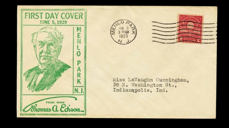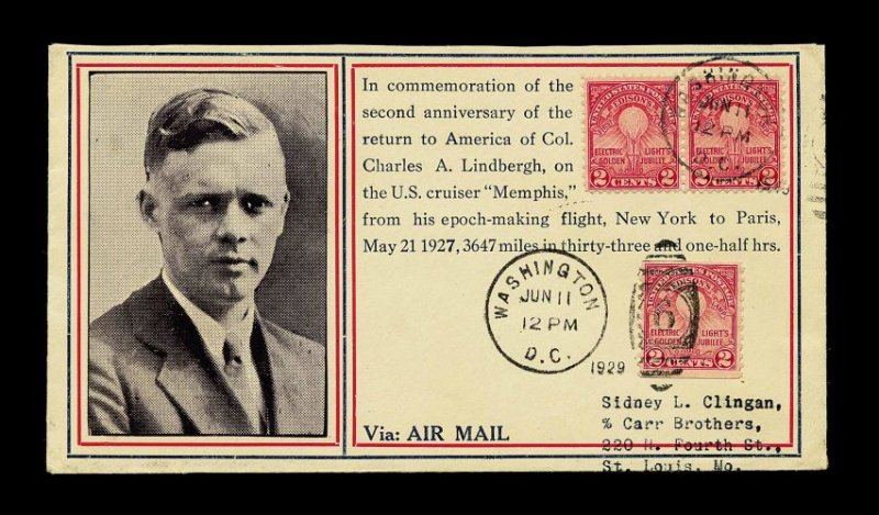1037 F 655, 656 image#655, 656, 2c Electric Light Jubilee, perf. 10 and coil, pair of the former and single of the latter tied to a combination first day cover by "Washington, D.C./June 11/1929" duplex cancels on unlisted Emeigh Lindbergh printed cachet in red, blue and black, very fine; the combination in itself is quite scarce, but coupled with the unusual cachet makes this one of the most desirable Edison first day covers. (Image) Mellone 400.00+