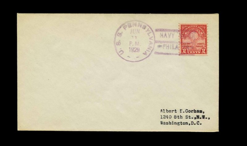 1038 F 656 image#656, 2c Electric Light Jubilee coil, tied to first day cover by purple "U.S.S. Pennsylvania/Jun 11/1929/Navy Yard/Philadelphia" handstamp, addressed to Gorham, very fine; the only recorded example of this cancel on this issue. (Image) Est. 150-200
