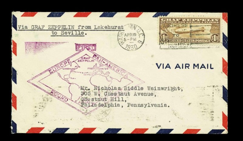 1122 F C14 image#C14, $1.30 Graf Zeppelin, tied to flown first day cover by "Washington, D.C./Apr 19/1930" machine cancel, addressed to Philadelphia, proper cachet and backstamps, very fine. (Image) Mellone 1,000.00
