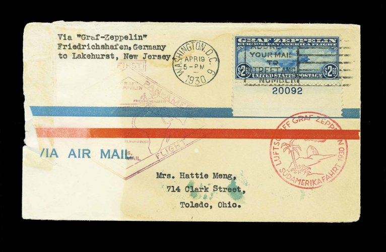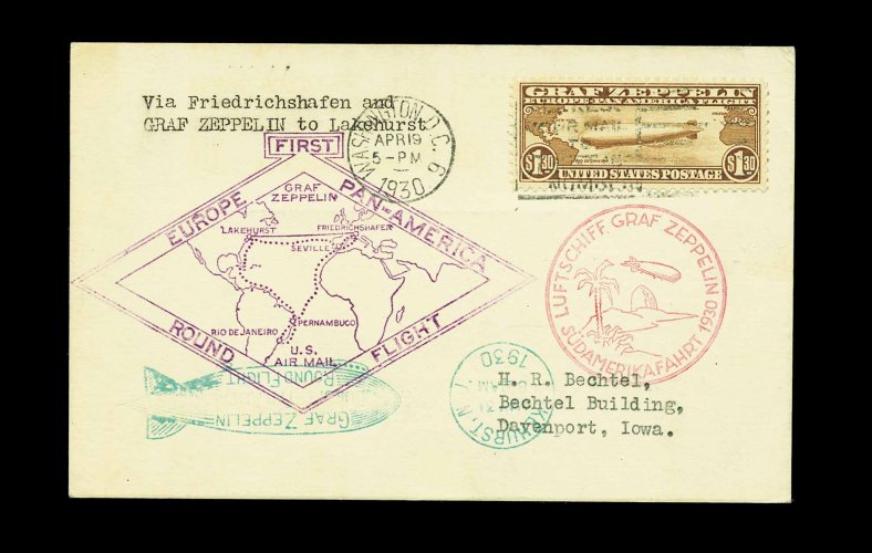 1123 F C14 image#C14, $1.30 Graf Zeppelin, tied to flown first day card by "Washington, D.C./Apr 19/1930" machine cancel, addressed to Davenport, Iowa, proper cachets and receivers, fresh and very fine. (Image) Mellone 1,000.00