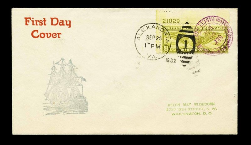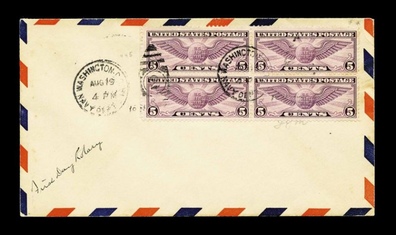 1125 F C16 image#C16, 5c Violet, block of four tied to first day cover by "Washington, D.C. Navy Dept. Sta./Aug 19/1931" duplex pmk., unaddressed, very fine; the only known example of this stamp with this cancel. (Image) Est. 300-400