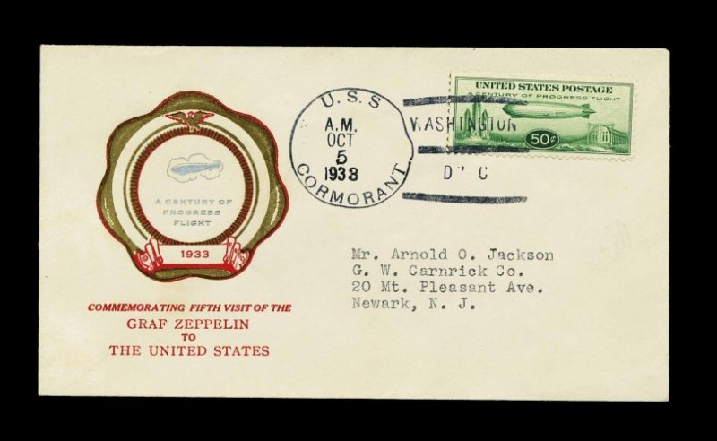 1127 F C18 image#C18, 50c Graf Zeppelin, tied to first day cover by "U.S.S. Cormorant/Oct 5/1933" and matching "Washington D.C." in bars pmk., with F.R. Rice cachet (Planty #2) at left, some really trivial surface rubs at left, still very fine; reportedly unique with this cachet and postmark. (Image) Est. 400-500