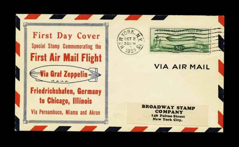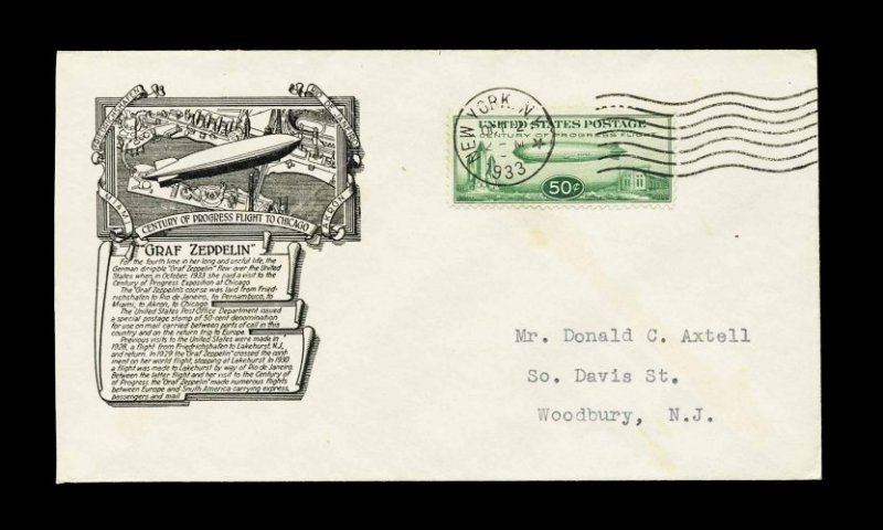 1131 F C18 image#C18, 50c Graf Zeppelin, tied to first day cover by "New York N.Y./Oct 2/1933" machine pmk., with very scarce Poppenger cachet in green, at left, faint cover bend at top right affects stamp, otherwise very fine; a seldom seen cachet. (Image) Est. 400-500