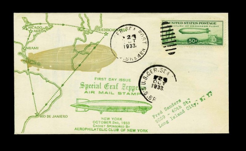 1129 F C18 image#C18, 50c Graf Zeppelin, tied to first day cover by unofficial "S.S. Bremen U.S. Ger. Sea Post/2 Oct/1933" duplex pmk., with Linprint cachet (Planty #8), addressed and serviced by Sanders, choice very fine; an exceptionally rare if not unique unofficial postmark. (Image) Est. 500-750