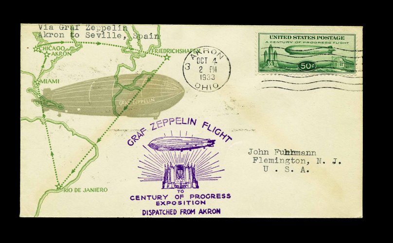 1130 F C18 image#C18, 50c Graf Zeppelin, tied to flown first day cover by "Akron Ohio/Oct 4/1933" machine pmk., with Linprint cachet (Planty #8), flown on the scarcer Seville flight, very fine. (Image) Mellone 425.00+