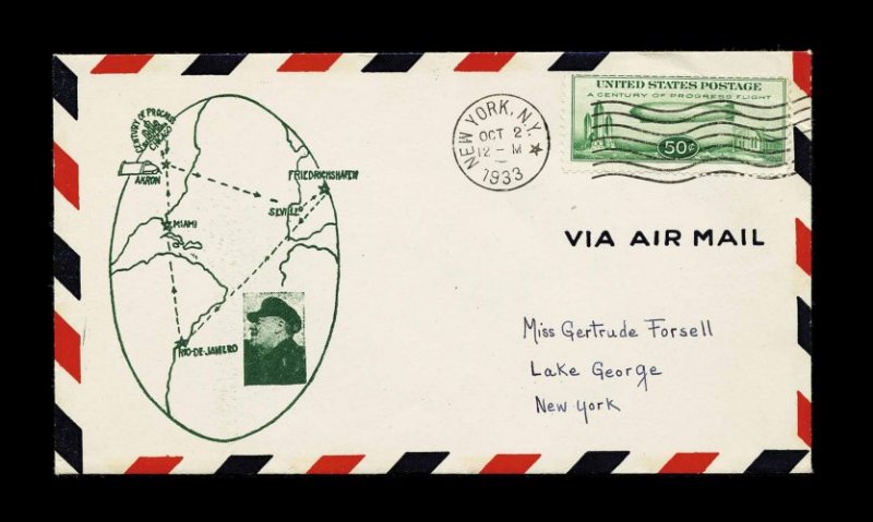 1128 F C18 image#C18, 50c Graf Zeppelin, tied to first day cover by "New York N.Y./Oct 2/1933" machine pmk., with Ed Hacker cachet (Planty #3) at left, uncommonly fresh, extremely fine; one of the scarcest of all the #C18 cachets. (Image) Est. 400-500
