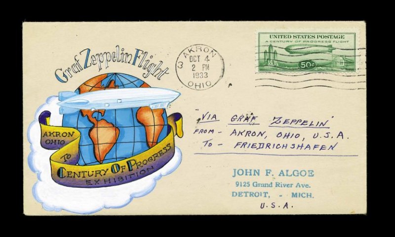 1132 F C18 image#C18, 50c Graf Zeppelin, tied to flown first day cover by "Akron Ohio/Oct 4/1933" machine pmk., with beautiful multicolored Barbara Montgomery add-on cachet, extremely fine with great eye-appeal. (Image) Mellone 425.00