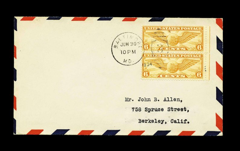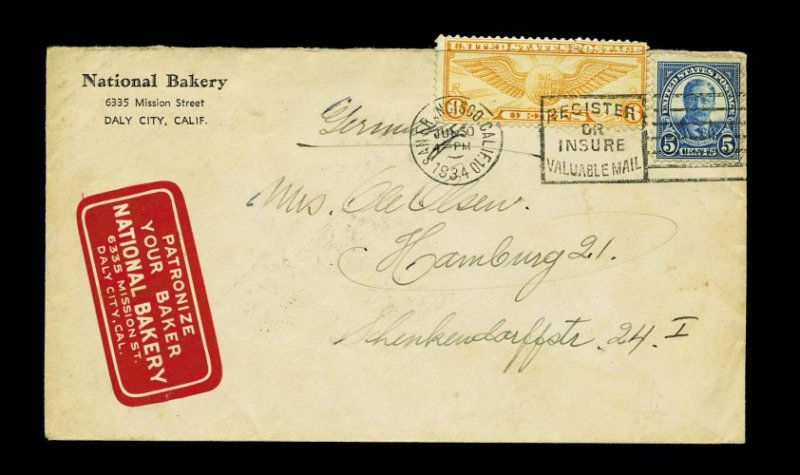 1134 F C19 image#C19, 6c Orange, tied along with 5c Roosevelt to first day cover by "San Francisco Calif./Jun 30/1934" machine pmk., red National Bakery corner card, sent to Germany, air post stamp with fault from overlapping at top edge, cover with some faint soiling from being commercially used, very fine appearance; this San Francisco first day usage is unique, in addition to being an extraordinary usage paying the correct rate to a foreign destination. (Image) Mellone 1,500.00+