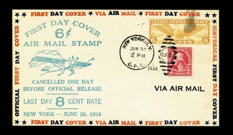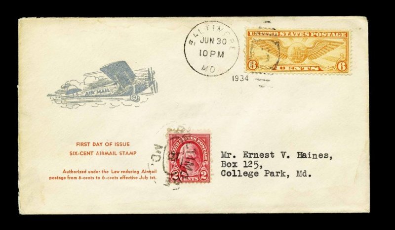 1135 F C19 image#C19, 6c Orange, tied to first day cover along with 2c Washington by "Baltimore Md/June 30/1934" handstamped duplex, with F.R. Rice cachet in red and silver (Planty #1B), very slight edge soiling of little consequence, very fine; reportedly the only known example of this cachet on a June 30 first day cover. (Image) Mellone 600.00