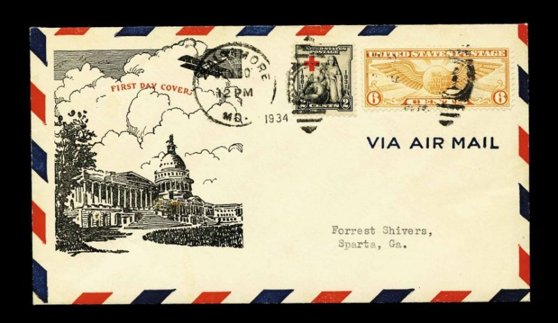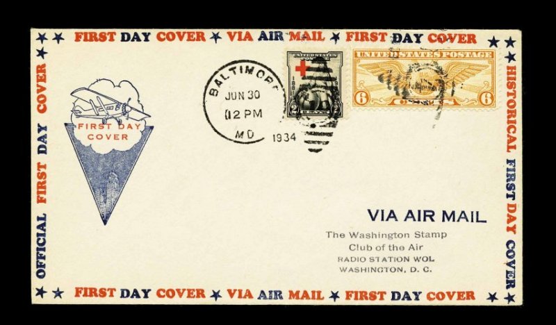 1137 F C19 image#C19, 6c Orange, tied to first day cover along with 2c Red Cross by "Baltimore Md./Jun 30/1934" handstamped duplex, with Harry Ioor cachet (Planty #21), very fine; 1977 AFDCS certificate. (Image) Mellone 600.00