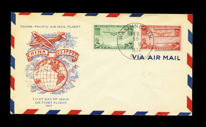 1140 F C20-22 image#C20-22, 20c-50c China Clipper, fourteen first day covers, four cacheted #C20 including one from Newark Airfield, six cacheted #C21 or C22 including three with blocks, two with #C21 and C22 (both cacheted), very fine group. (Image) Mellone 760.00