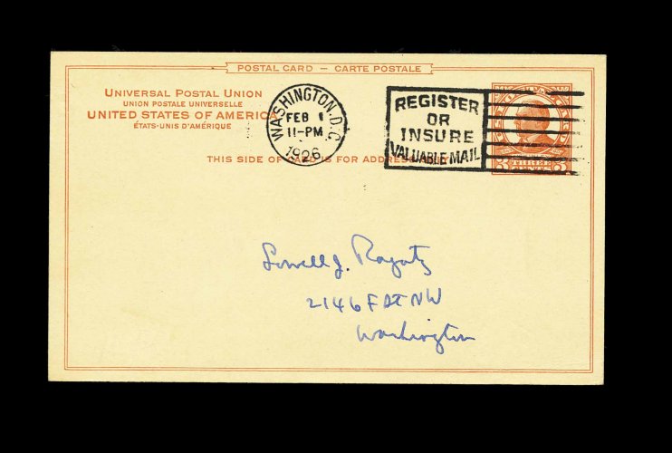 1141 F UX37 image#UX37, 3c Red on buff postal card, cancelled by first day "Washington, D.C./Feb 1/1926" machine cancel, very fine; most of these first day issues were hand cancelled, only a small fraction were machine cancelled; 1998 APS certificate; the Mellone catalog value is for hand cancelled. (Image) Mellone 200.00+