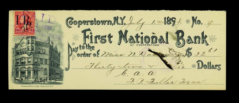 1142 F R155 image#R155, 2c Pink, with "I.R." overprint, tied to check of First National Bank of Cooperstown, N.Y. by violet "Paid/Jul 1 1898/First National Bank" handstamp and ms. mark, representing a first day usage, check with trivial tear from usage, very fine and rare; accompanied by a second example illegally used for postage on a June 30, 1898 pre-first day cover (accompanied by a 1998 APS certificate); a great pair of items for the specialist; the predate is not listed in Mellone. (Image) Mellone 1,000.00+