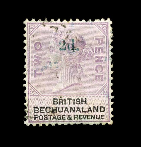 1148 O 27 image#27, 1888 "2d." surcharge in green on 2p Lilac, used, exceedingly well centered for this, lightly cancelled, minor thin spots, very fine appearance; this was originally a trial color overprint, one sheet being accidentally put into use at Vryburg, only a very small number have survived; 2002 BPA certificate (S.G. #23c; £2,750). (Image) 2,500.00