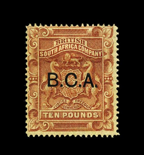 1149 ng 17 image#17, 1891 £10 Red Brown, with "B.C.A." ovpt., unused, strong rich color, fine; a rare and seldom offered high value; 2002 BPA certificate (S.G. #17; £3,250). (Image) 3,250.00