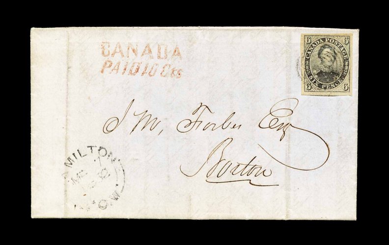 1151 c 2 image#2, 1851 6p Slate violet on laid paper, a select example with large to huge margins, including a part of the adjoining stamp at bottom, tied to an 1852 folded letter to Boston by a light strike of a target pmk., matching "Hamilton C.W./Mr 7, 1852" c.d.s. at bottom left, excellent strike of red two line "Canada/Paid 10 Cts" exchange handstamp, two light vertical file folds well away from stamp, extremely fine; an especially choice 1851 Six Pence cover; ex-Dale-Lichtenstein. (Image) Est. 1,500-2,000