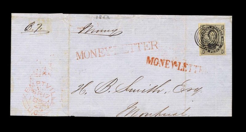 1152 O 2 image#2, 1851 6p Slate violet on laid paper, choice single featuring large to very large margins, in addition to possessing outstanding color and impression, tied to large part of cover front to Montreal by superb strike of target pmk., red "Kemptville, U.C./Sp 17, 1852" c.d.s. at bottom left, straightline strikes of two different red "Money-Letter" handstamps, two light vertical file folds, very fine; the stamp itself is extremely fine and quite choice; ex-Dale-Lichtenstein. (Image) Est. 1,500-2,000