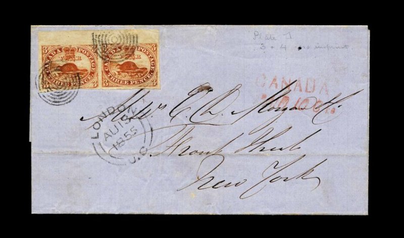 1154 c 4 image#4, 1852 3p Red, a gorgeous top sheet-margin horizontal pair, with large to huge margins all around (except just touching at bottom of left stamp), deep luxuriant color and impression, tied by two neat strikes of target pmks. to 1855 cover to New York, matching "London, U.C./Au 18, 1855" c.d.s. just below, red two line "Canada/Paid 10 Cts" exchange handstamp, entire with light horizontal file fold and insignificant tear at top, extremely fine; a wonderfully choice and desirable Three Cent "Beaver" cover; ex-Dale-Lichtenstein (where it was a featured item in color). (Image) Est. 1,500-2,000