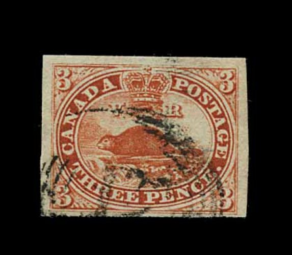 1155 O 4c image#4c, 1852 3p Red on ribbed soft paper, a gem used example of this very scarce and distinctive paper variety, boasting four lavishly large and especially well balanced margins, rich luxuriant color, four-ring numeral cancel, extremely fine; seldom encountered in any quality, let alone in this outstanding condition; 1992 V.G. Greene certificate; ex-"Crossings" Collection (Unitrade C$750.00). (Image) 450.00