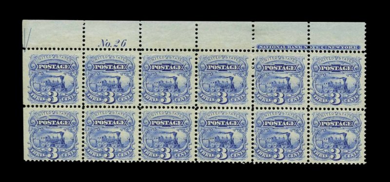 102 ogX 114 image#114, 3c Ultramarine, a pristine full top margin imprint, half arrow and plate "No. 26" block of twelve, wonderfully bright and fresh, with deep rich color and prooflike impression, strong and intact perforations, quite well centered, particularly for a classic 19th century plate block, full clean o.g. which shows interesting split grill impressions well, lightly hinged on three stamps only, rest n.h., very fine and choice; one of the finest quality Three Cent 1869 Pictorial plate blocks to come on the market in quite some time; Chapin census #330; 1988 PF certificate. (Image) 8,150.00+