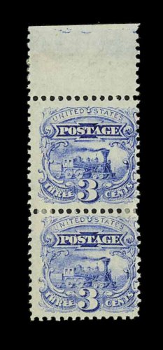 103 og 114a image#114a, 3c Ultramarine, without grill, a most unusual top sheet-margin mint pair, the top stamp being the without grill variety, while the bottom stamp is normally grilled, quite fresh and bright, centered a bit to right, full o.g., couple of hinge strips sensibly reinforcing the pair, fine; the without grill is very scarce and is particularly desirable in this "se-tenant" format with a normal stamp; 1994 PSE certificate; ex-Cutts and Howard. (Image) 1,400.00+