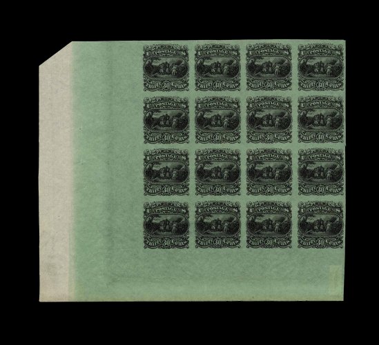112 Ebl 121-E1p image#121E1p, 30c Burgoyne black plate essay on thin pale green surface tinted paper, a showpiece bottom left corner sheet-margin block of 16 (4x4), featuring enormous sheet margins and large margins elsewhere, marvelously fresh and crisp, extremely fine; certainly one of the largest surviving multiples of the 30c Burgoyne plate essay; ex-Brazer. (Image) as singles 4,400.00+