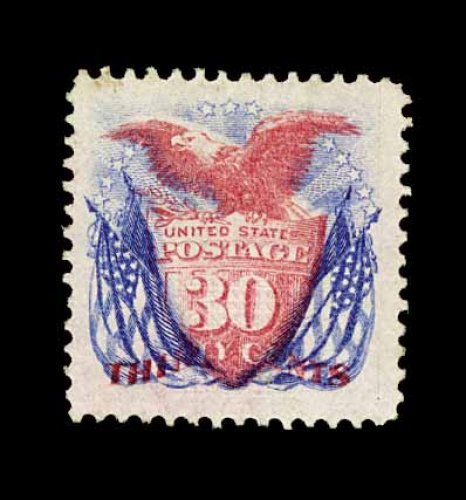 113 ng 121 image#121, 30c Blue and carmine, a jumbo margined unused single, possessing absolutely gigantic margins and being wonderfully well centered within them, lovely rich colors and strong impressions, really trivial tiny faint stains at top left, otherwise extremely fine; one of the largest 30c 1869 Pictorials in existence; clear 1988 PF certificate and a 2001 PF certificate noting the tiny stains. (Image) 3,400.00