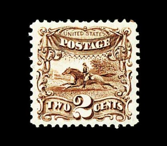 119 og 124 image#124, 2c Brown re-issue, a phenomenal quality mint example of this value, possessing absolutely enormous margins that are unheard of on this or any other value from the 1869 Pictorial re-issue set, and being perfectly centered within this vast expanse, prooflike color and impression, full o.g., relatively lightly hinged, extremely fine; a remarkable gem that is unquestionably the finest original gum Two Cent 1869 Pictorial re-issue we have ever seen, and we doubt very much that this stamp's equal exists. (Image) 700.00