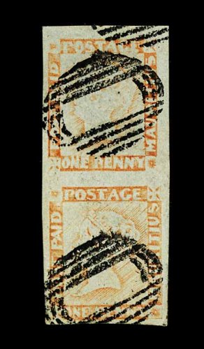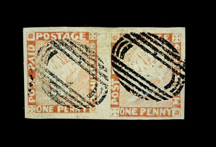 1222 O 5b image#5b, 1848 1p Orange red, worn impression on bluish paper, vertical pair, large margins all around, cancelled by barred oval obliterator, lower stamp has light horizontal crease, otherwise very fine (S.G. #18; £750+). (Image) 700.00+