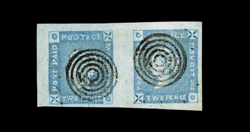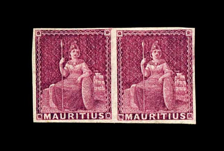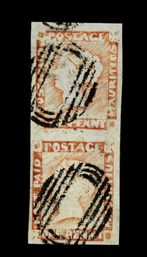 1226 Oc S.G. #39ab, 39ac image#39ab, 39ac, 1859 (Nov.) 2p Blue "Lapirot" issue, the unique used horizontal pairs showing the remarkable "Maurituis" and "Mauritus" spelling errors from the retouched plate; the "Maurituis" error being the right stamp in a superb horizontal pair, positions 7-8 from the plate of 12, featuring large to enormous margins all around, with strong color and an excellent impression, each stamp with neat clear strike of target cancel, with the postmark on the right stamp wonderfully positioned so that the spelling error is completely unobscured, extremely fine; the "Mauritus" error being being the left stamp in a horizontal pair, positions 9-10, and used on an 1859 entire from Thomas La Chambre & Co. in Port Louis to Portrieux, France, sent "Via Suez and Marseille", clear "G.P.O./Nov 9, 1859/Mauritius" double ring c.d.s. on reverse, red Suez transit c.d.s. on front, along with numerous transit and arrival postmarks on reverse, pair with clear even margins all around, wonderfully postmarked with two clear "PAID" in circle cancels, neither of which obscures the spelling error, addressee's name partially erased, light split at top of cover from central filing fold well away from adhesives, very fine. It seems clear that the re-engraving of the worn out "Lapirot" plate imagetook place immediately before the re-engraving of the original 2p "Post Paid" plate (attributed to Sherwin), as the above mentioned cover is dated November 9, 1859, while the earliest recorded "Sherwin" cover is dated November 10, 1859. It is likely that the spelling errors were noticed as soon as the sheets were printed from the retouched Lapirot plate, leading to its immediate withdrawal from use, and being replaced by the "Sherwin" plate. Then on December 12th the "Dardenne" lithographed issue came into use. Each of these spectacular spelling errors are the only recorded examples, and despite their obvious appearance they, quite remarkably, remained undiscovered for over 130 years. In fact, they resided unnoticed in the magnificent "Kanai" collection, the most important collection of classic Mauritius ever formed, and they were even illustrated in Classic Mauritius (pages 93-94) - again without reference to their unique nature. Even the subsequent owner failed to recognize that two major spelling errors had occurred in the course of re-engraving, as the country name "Mauritius" appears as "Maurituis" on position 8, and "Mauritus" on position 9. These two errors of spelling, as a result of re-engraving, are without equal in British Empire Philately, and the two pairs clearly rank among the most important and extraordinary classic errors in existence. They may be ranked alongside the inverted head of the 1854 4a of India and the 1855 4p inverted swan of Australia. Yet, there remains a significant difference between these more well-known errors and the two error pairs offered here - the "Maurituis" and "Mauritus" errors are unique. Each is accompanied by a 1994 BPA certificate specifically describing the errors. (Image) S.G. £200,000