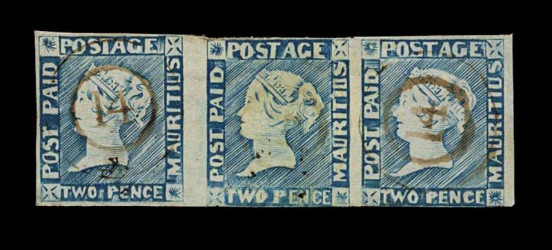 1224 O 6b image#6b, 1848 2p Blue early worn impression on bluish paper, very rare used horizontal strip of three being the lower row of the sheet, very clear printing for this primitive classic, margins full to touched due to slightly rough separation, light but distinct "14" in double circle cancellation, two tiny tears at top, very fine appearance; an impressive multiple; clear 1958 PF certificate and a 2002 PF certificate; ex-Palace collection (S.G. #22; £2,250+). (Image) 2,025.00+