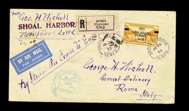 1227 c C18 image#C18, 1933 $4.50 on 75c Balbo flight surcharge, exceptionally well centered and margined single tied to registered flown cover to Rome, Italy by "Shoal Harbour, Newf'd/Jul 26 '33" violet c.d.s., with green circular Balbo flight cachet, Rome bksts., very fine; a scarce and handsome cover. (Image) 825.00