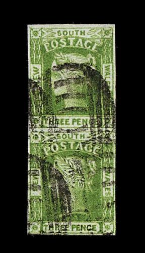 1223 O 5c image#5c, 1848 1p Brownish red, worn impression on bluish paper, vertical pair, deep color and large even margins with neat oval barred obliterator, minute paper fault in margin at right between the stamps, very fine; clear 2002 PF certificate; ex-Caspary (S.G. #19; £750+). (Image) 700.00+