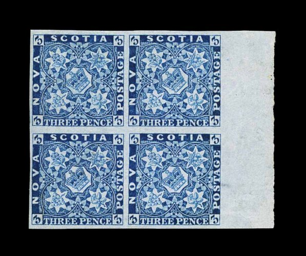 1229 ogbl 2 image#2, 3p Blue, a very scarce right sheet-margin mint block of four, with extra-large sheet margin, other margins quite large and well balanced, prooflike color and impression on richly blued paper, large part o.g., bottom right stamp with trivial small thin spot, otherwise extremely fine; an especially handsome classic multiple; ex-Moody (Unitrade C$4,000.00+). (Image) 2,400.00+